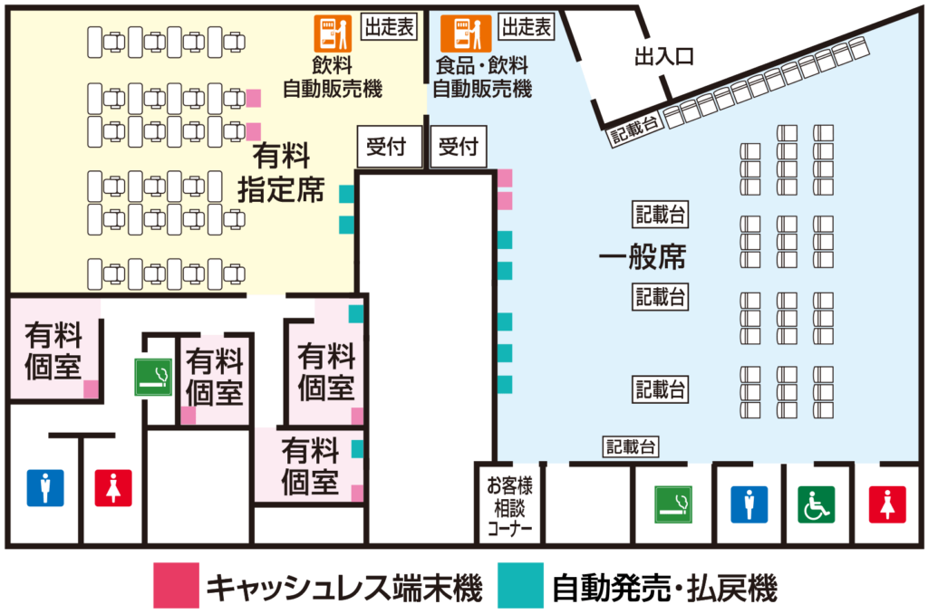 室内に自動発売・払戻機、キャッシュレス専用端末機(卓上式)を配備。ゆったりとした空間でお仲間と楽しくご観戦いただけます。